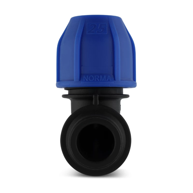 Coude fileté à compression FM Norma pour tubes PEHD, pression 6‑16 bars. Montage rapide et étanchéité parfaite.