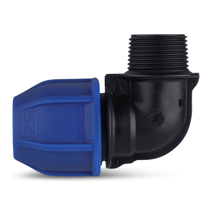 Coude fileté à compression FM Norma pour tubes PEHD, pression 6‑16 bars. Montage rapide et étanchéité parfaite.